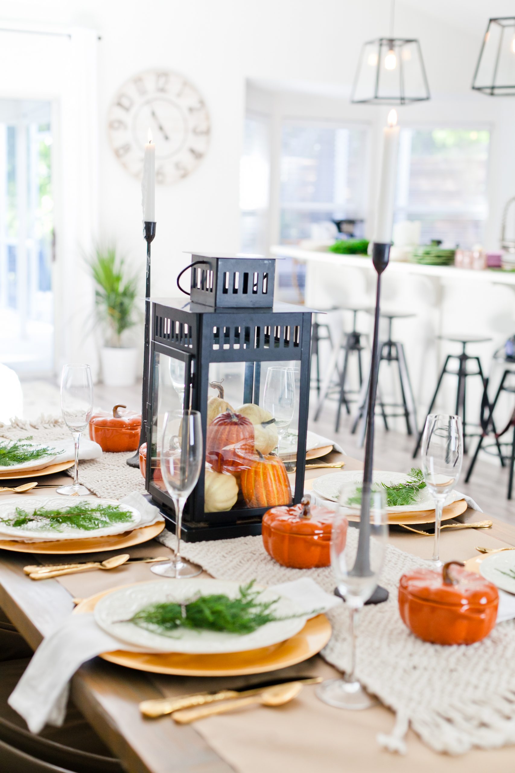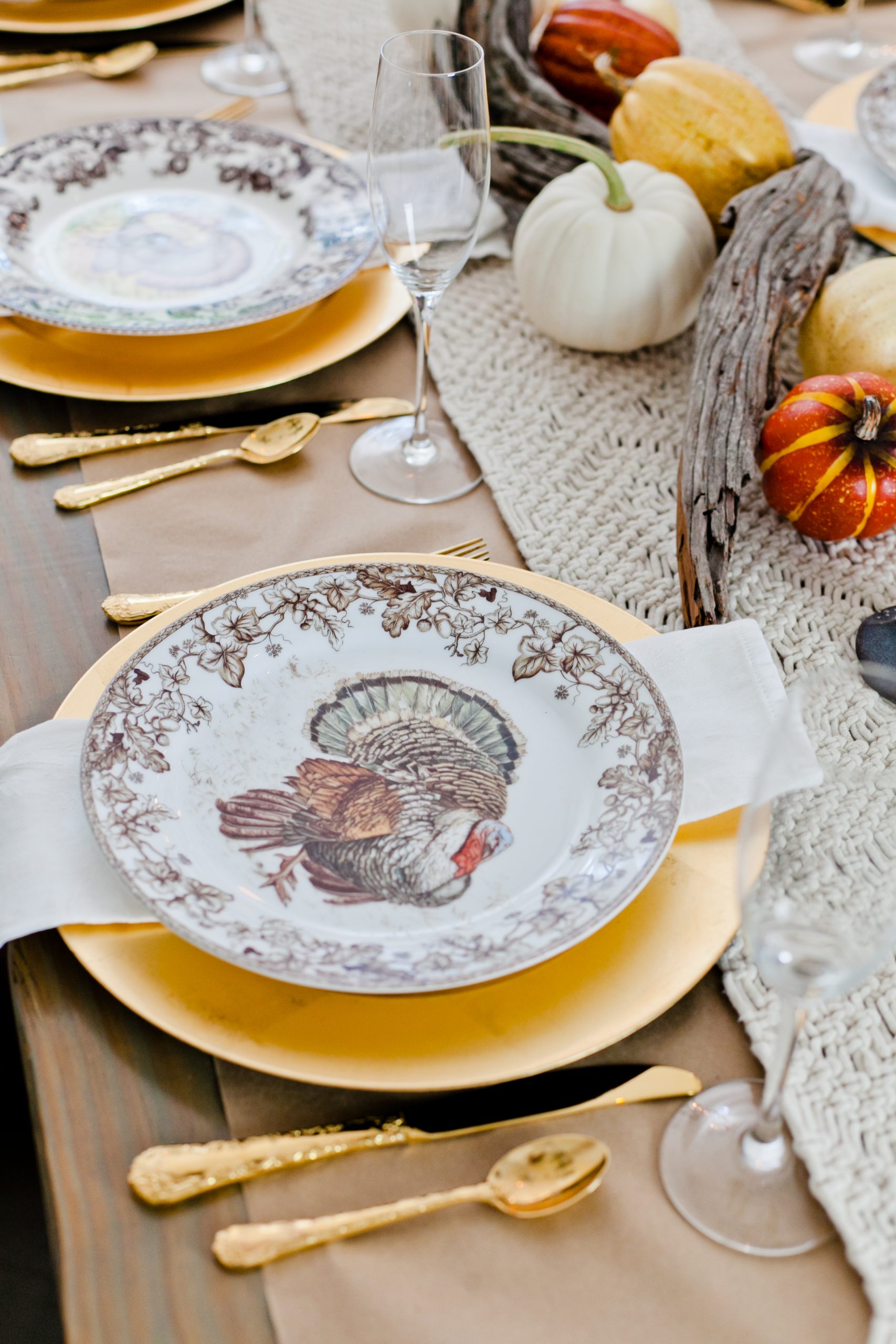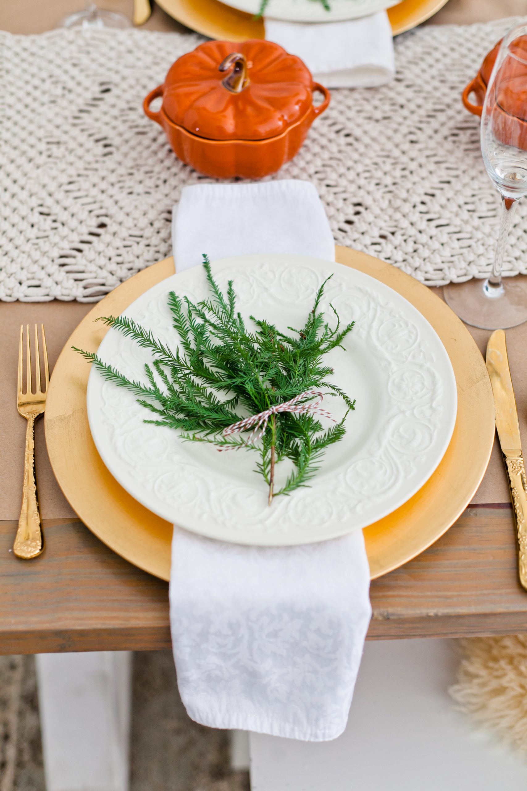 Use craft paper as the basis of your tablescape. You can keep it plain or layer it with different runners. We used sheer tulle, macrame and linen for three different styles. You can also use it by itself and add crayons or pens for the kids to show their creativity, or encourage them to write out what they are thankful for.