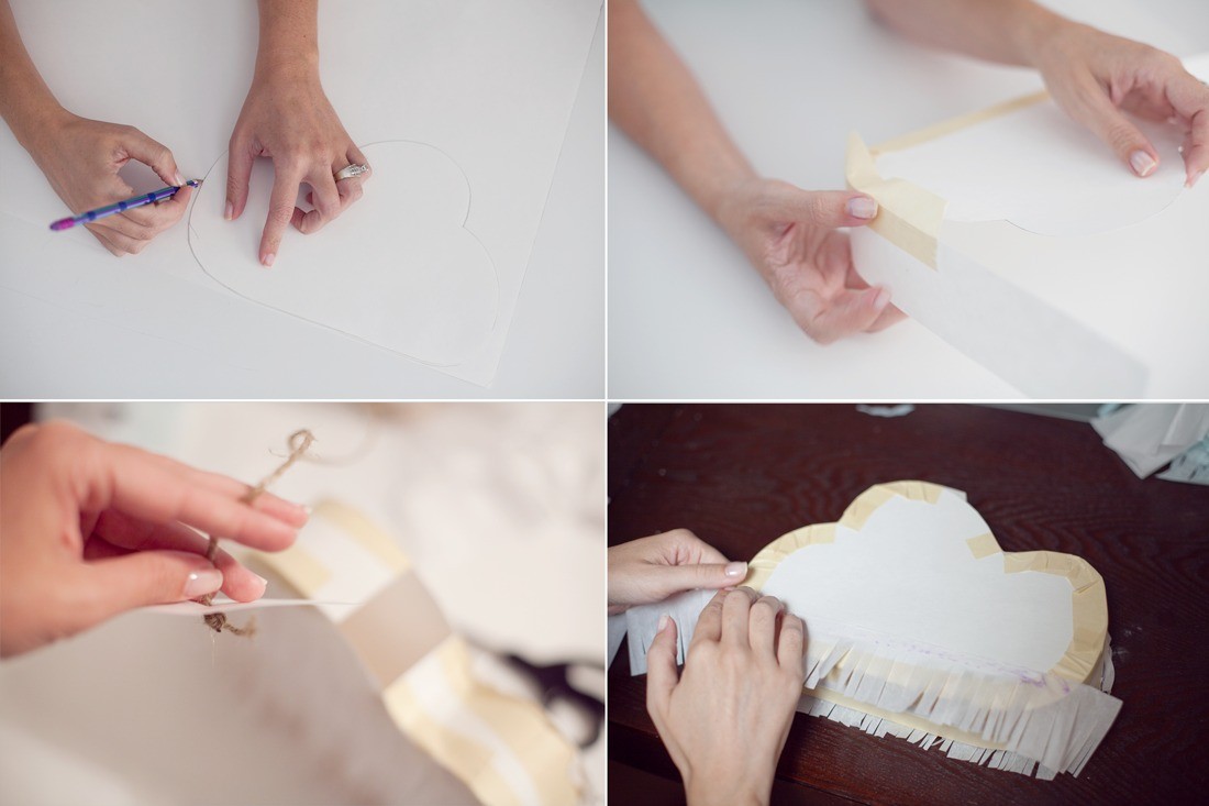 Step One: Trace your shape, I drew a cloud shape, onto your poster board or card stock and cut out. Use your cut-out to trace a second matching shape and cut out. This will be your front and back of the piñata. With your remaining paper, cut out long strips about 1 1/2 inches wide. If you’re using poster board, cut your strips lengthwise so that you have one or two long strips.