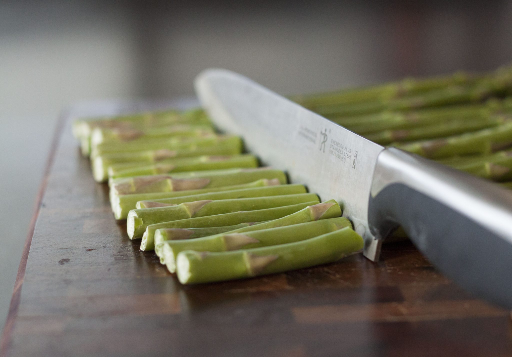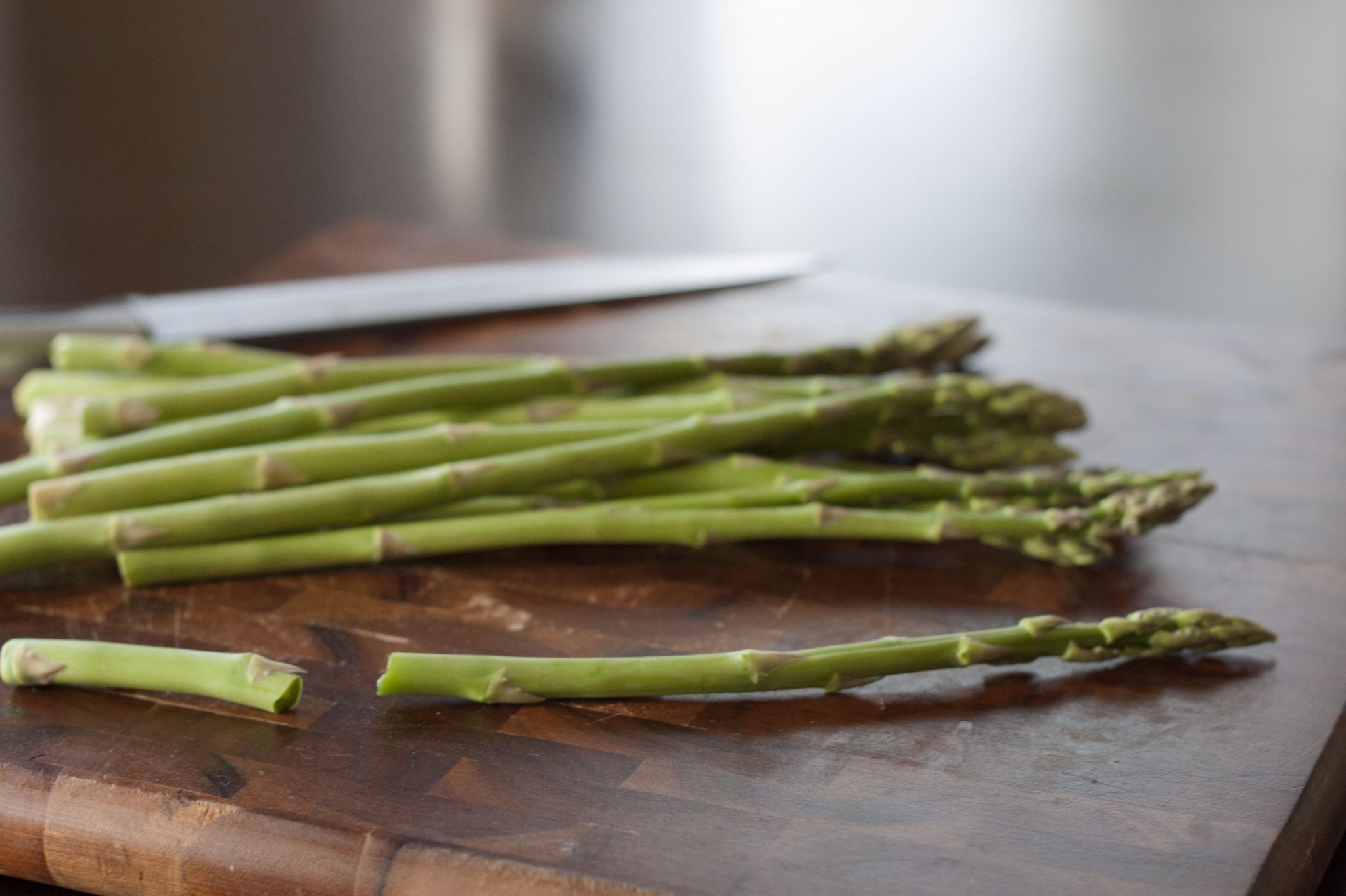Start with nice bunch of asparagus and wash it well. You’ll want to cut off the ends to clean it up. I recently read where you should take one stalk and snap it at the bottom and where it breaks is considered the “good part.” Not sure if it’s true, but I’ve been doing it anyway. It seems to work just fine!
