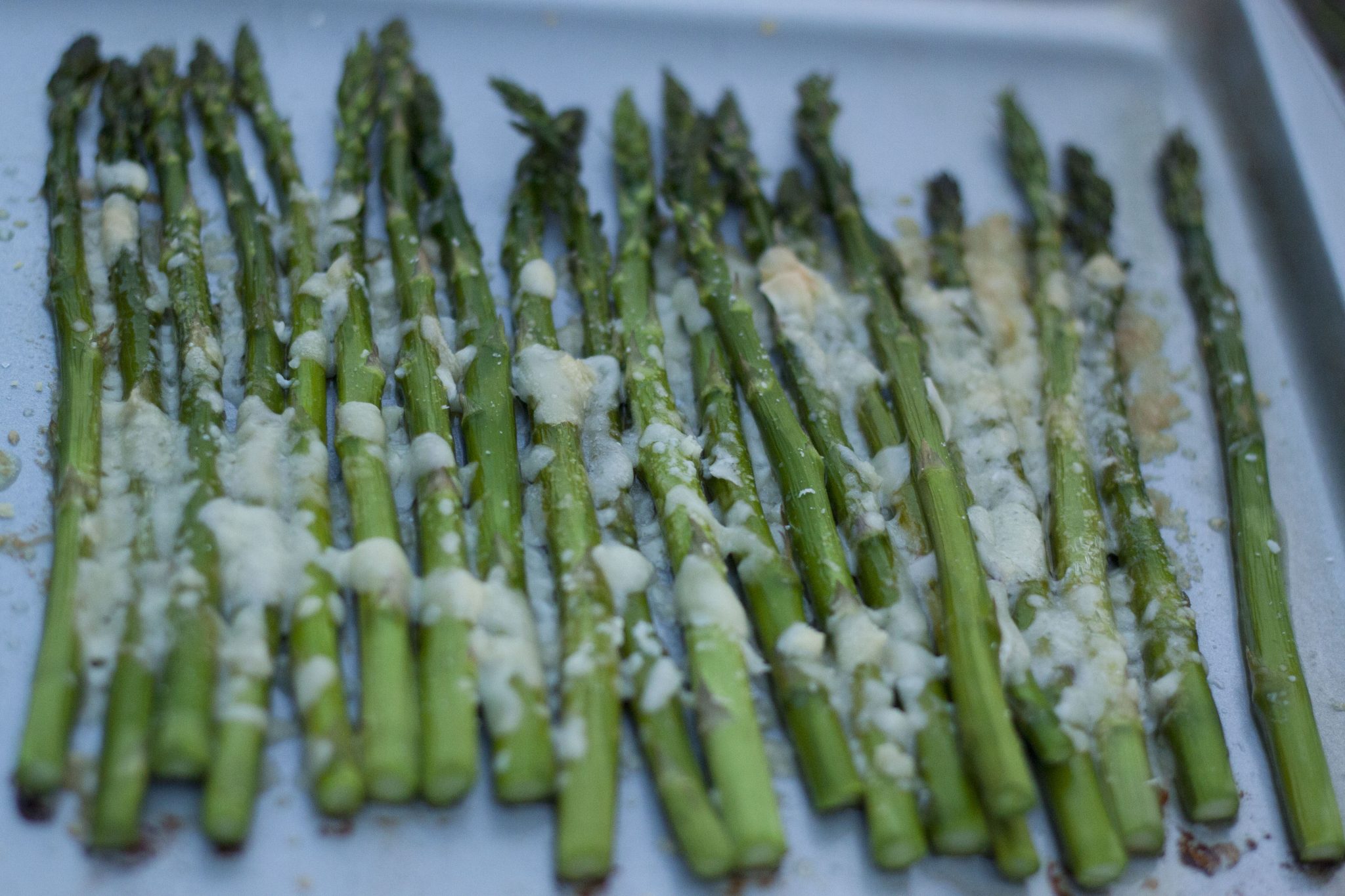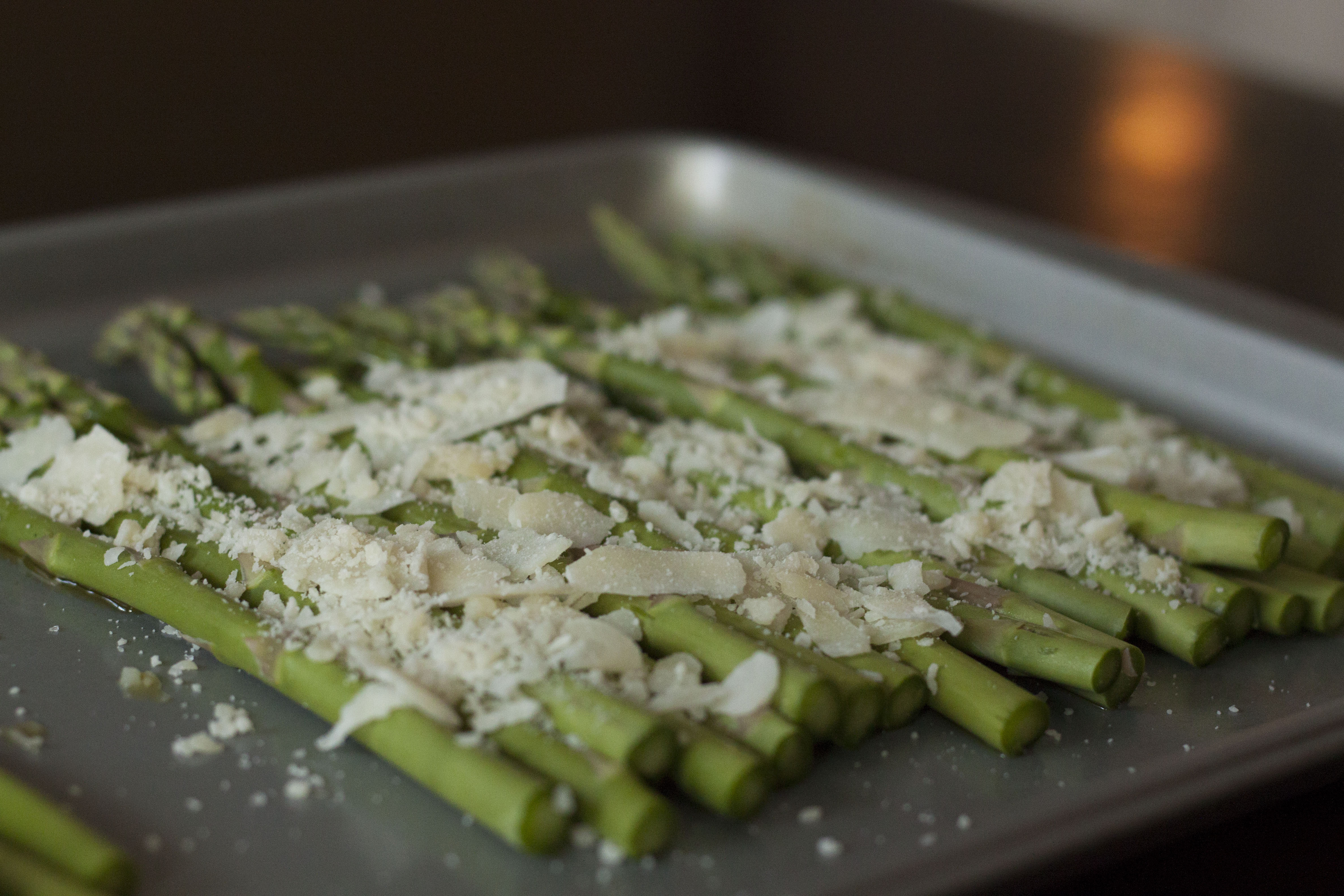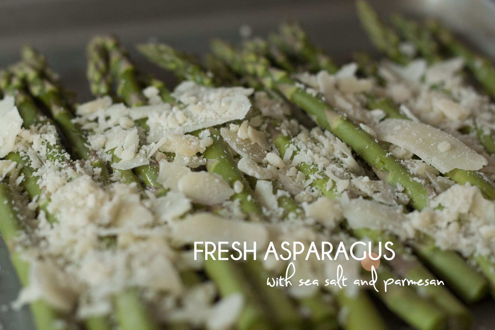 Preheat oven to 350 degrees. Wash asparagus and trim ends. Lay flat on roasting pan and drizzle with olive oil. Sprinkle on sea salt and finish with a layer of Parmesan cheese. Bake for approximately 15 minutes.