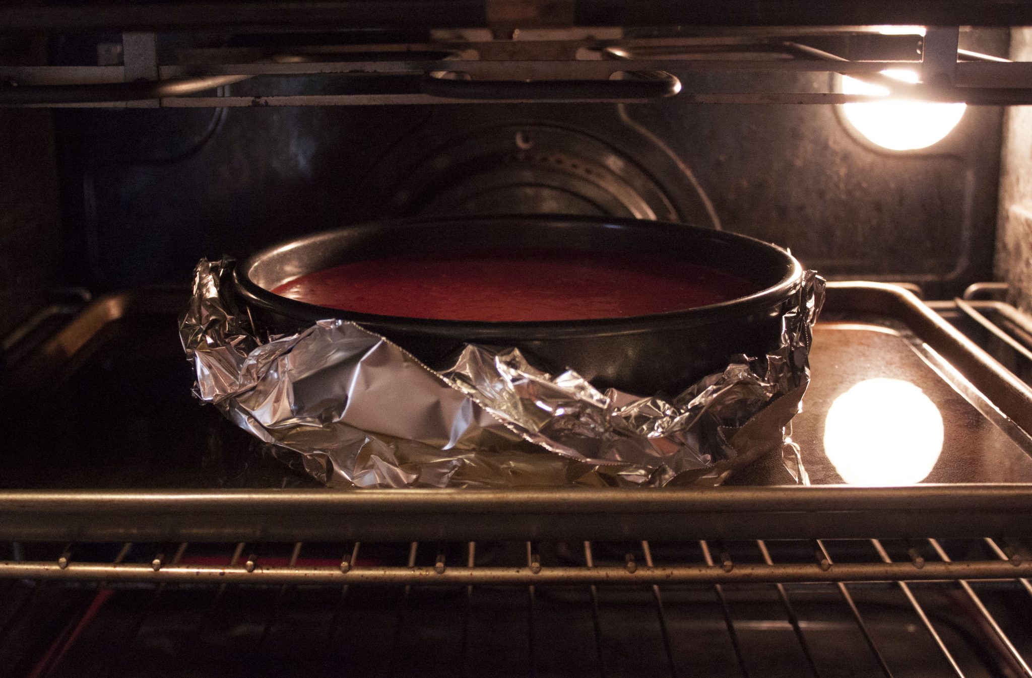Here’s the thing about the water bath. A water bath is supposed to help keep the cheesecake from cracking. I’ve made this particular cheesecake 6 or 7 times (What??? It’s delicious!) and since it was my first cheesecake ever, I followed the directions to a T that first time. My cheesecake looked beautiful. The next time I was lazy and it cracked… The moral of the story? Maybe whoever came up with this water bath situation has a point. So, I’ve been doing it ever since. And it keeps turning out. Now, if you don’t care if your cheesecake cracks? Skip it, it’s annoying.