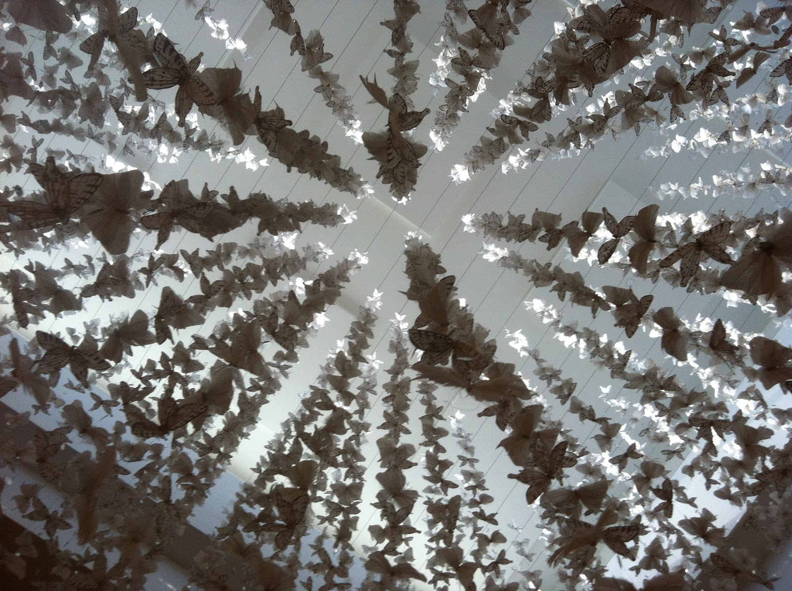 Recently we went to the mall to shop with our Christmas gift cards. We enjoyed a 20 minute, wonderful adventure of giving chase to my 22 month old and 5 yr old daughter all around Sephora, where my son was overwhelmed with joy at all the little bottles and jars right at his level. My daughter had to try each of the perfumes in the women’s section. Then both proceeded to climb into the facial chairs and under all the tables. After finally wrangling the children and purchasing our said items we try to escape without any incident. We mistakenly chose a path through a store which had another Sephora counter. The products, like the sound of some Pied Piper flute invoking a trance like state of mind, intrigued Fresh Mommy and she was whisked away to the counter. This induced the curiosity in my children as they began to look for something fun to do while they waited. They spotted the escalator. My son excitedly pointing to the moving stairway toward heaven caused me to surrender my own desires. We began the seemingly endless cycle of up and down requests from then on. At least the skyward view was softened by paper butterflies.
