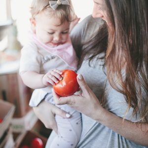 The baby and toddler years. At this stage, they’re just always by my side in general, so bringing them into the kitchen is pretty normal for any mom… they may sit in a highchair, crawl or walk around my feet. What’s great about this age with my little ones is just talking through what I’m doing. I’ll usually let them smell and see the food we’re using, we talk about colors and shapes and in general, it’s all about them feeling comfortable.
