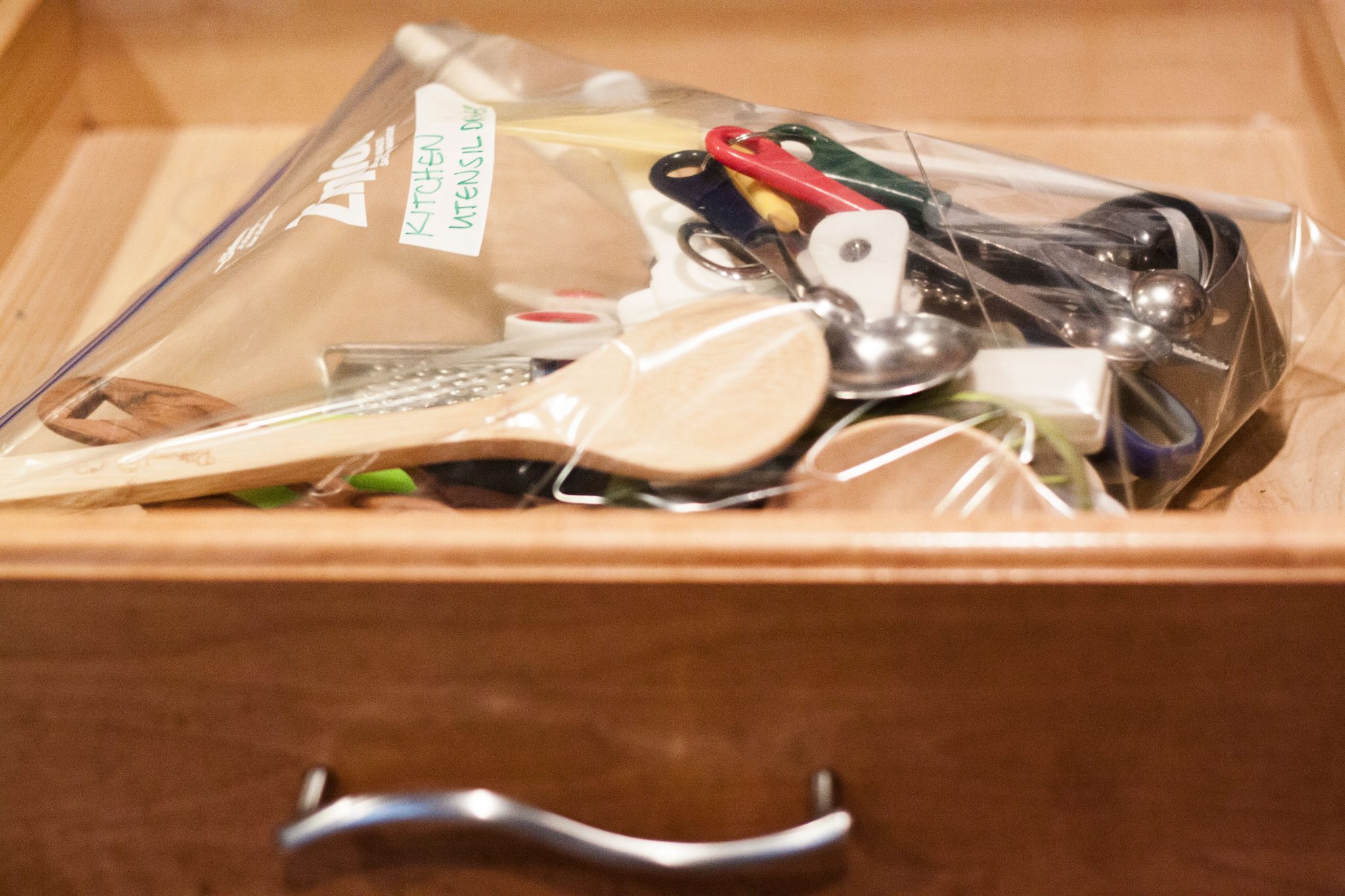 Bag and label all drawers. Using 2 gallon zip lock bags, every drawer from nightstands to utensils are bagged before the movers come (side note: this would also be useful when moving yourself, just do it as you are packing!). I originally came up with this plan after our first move. We would open boxes labeled “Living Room” and there would be a bunch of pens, cords, nail files, and a few remotes. It always took a few minutes of emptying before one of us realized that it was the random stuff from our end table drawers.