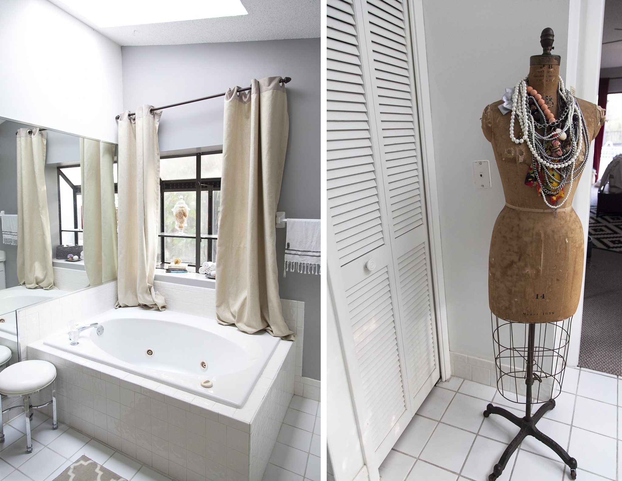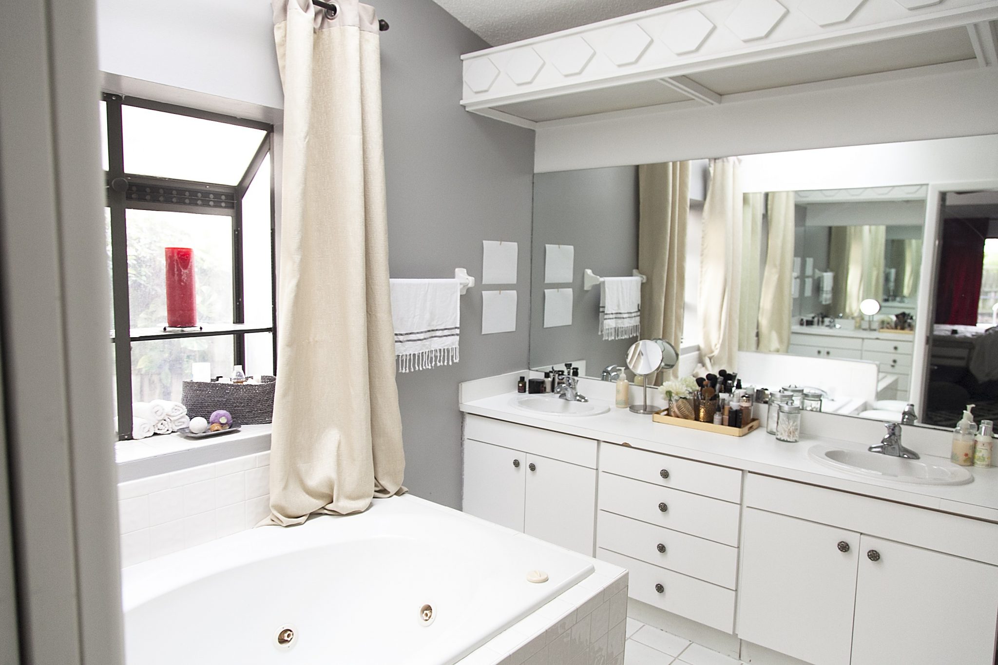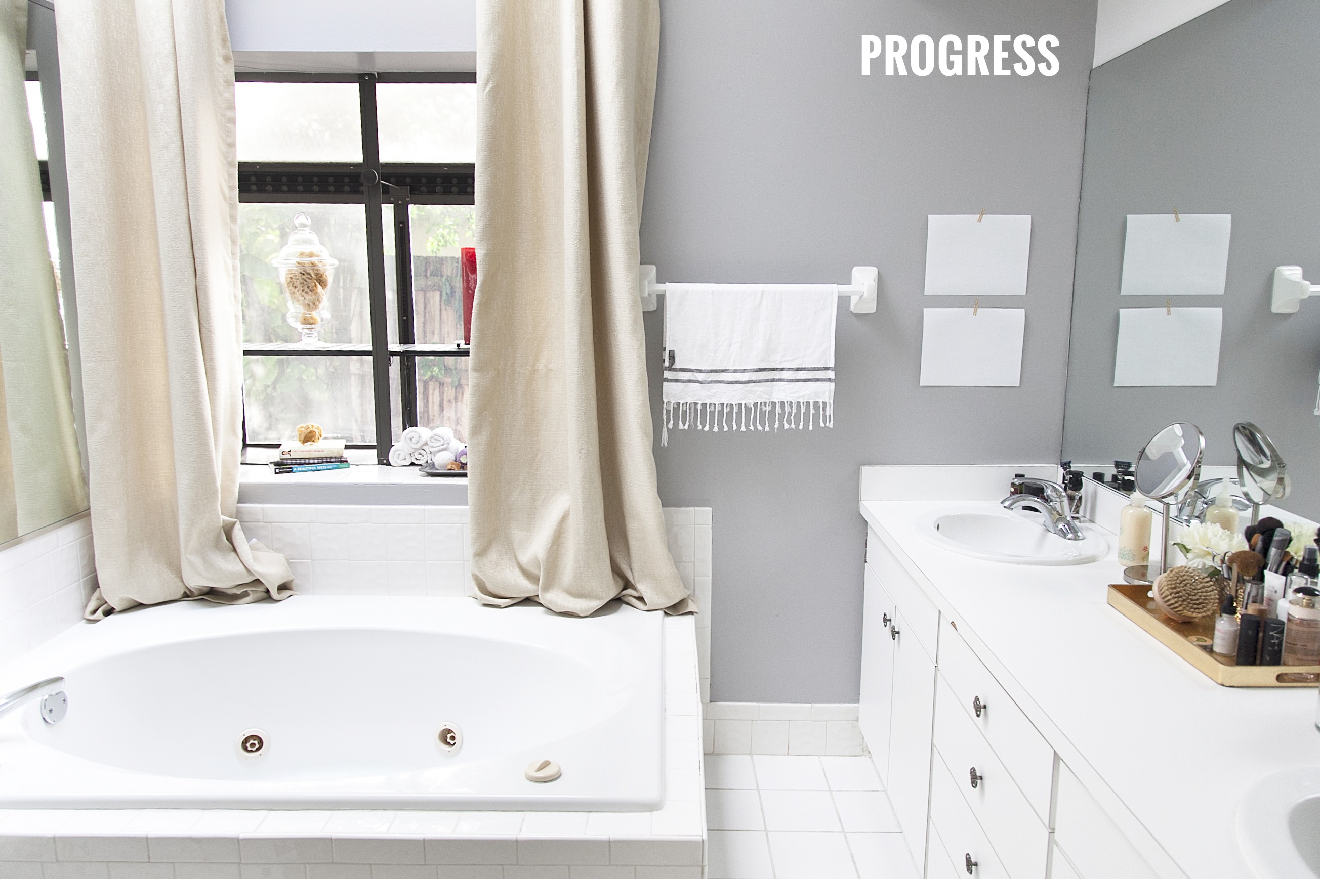 For now, here’s the progress of our bathroom. Since we can’t remove or replace any of the cabinets, mirrors, closet doors or lighting, we went with paint… and a lot of it. This space has been so much nicer and brighter since the new color on the walls, which we slapped on right before we moved in. Now it needs a good rug, some bright white curtain sheers that hang higher on the wall (we just used what we had already so the neighbors couldn’t see in) and plenty of art on the walls. You can see I’ve already started putting up papers to look at placement, though I want to fill that wall with a gallery of prints.