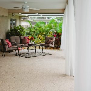 We hung sheer curtains (that are now hanging in our outdoor space at home) all along the shelter area for a softer, more serene effect.