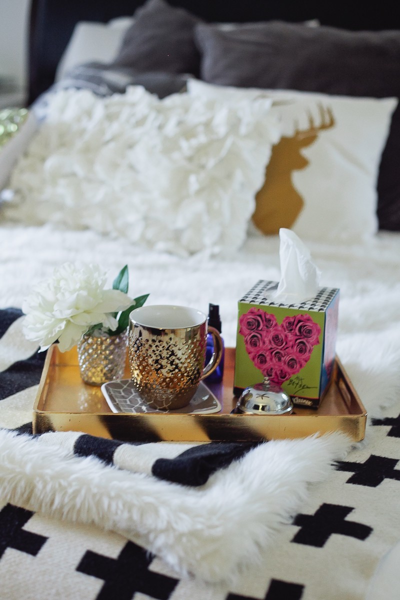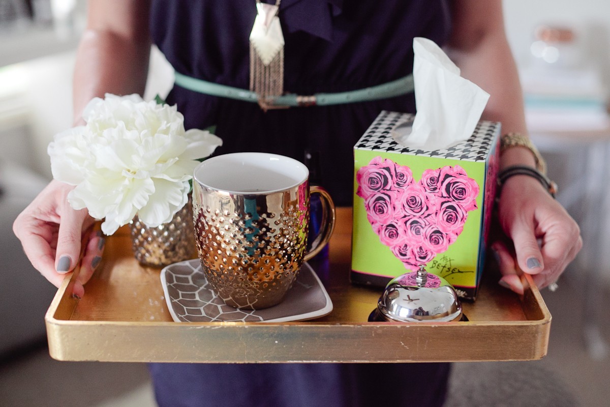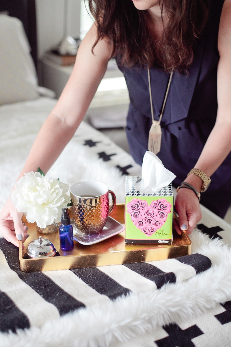 Of course the new Kleenex Brand Ready to Care Collection by Betsey Johnson takes it up a whole level in style and design! Since I’m always one that’s a sucker for great aesthetics, I couldn’t help but create a tray that makes anyone feel better, whether sick or not! How great would it be to give a little extra love with a morning cup of coffee or late night snack on a tray? Or create your own morning tray to have near you while you get ready in the morning… that special “you” time. Or what about creating a welcome tray for a guest room when friends or family come to stay with you?