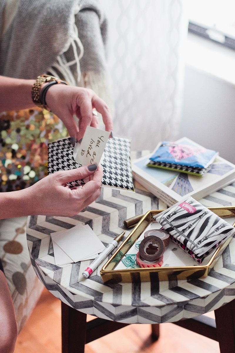 Another thing that says “love” and is a genuine “pick-me-up” is leaving sweet little notes for loved ones to find. My kids are head over heels for the Kleenex Brand tissue packs from the same Betsey Johnson line, Aliyah being all about that zippered design! I usually keep a stash of these in my purses, and am always sharing with people around me (yep, I’ve totally got the “mama” bag!). So why not up your lovin’ game and hand-write a few notes to leave for someone to find.