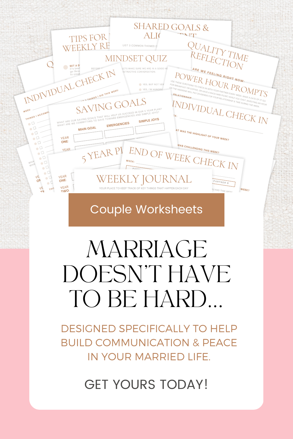 Are you feeling disconnected from your partner or struggling to keep your goals aligned? Our Ultimate Marriage Weekly Power Hour and Check-in Journal is designed to transform your relationship. With guided worksheets, you can improve communication, foster a peaceful marriage, and stay organized—all in just one hour a week!