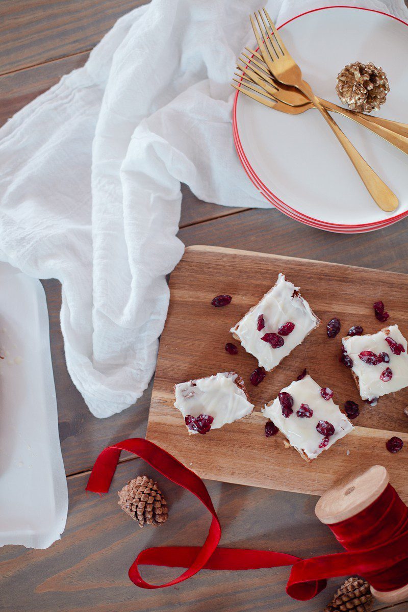 1. Mix together all the ingredients for the blondie and pour into a greased 11x13" pan, or two smaller pans. 2. Bake at 350 for 30 minutes. 3. Cool before frosting. For the Frosting 1. Mix together until smooth & spread over cooled blondie. 2. The frosting will be very creamy, feel free to place in the refrigerator or freezer to harden a little before topping with decoration or serving. For the Decoration 1. Cut blondie into bars. 2. Sprinkle cranberries over the top. 3. Warm the white chocolate chips in a microwave safe dish for 15 second intervals and stir in between. 4. Drizzle over the top of the bars.