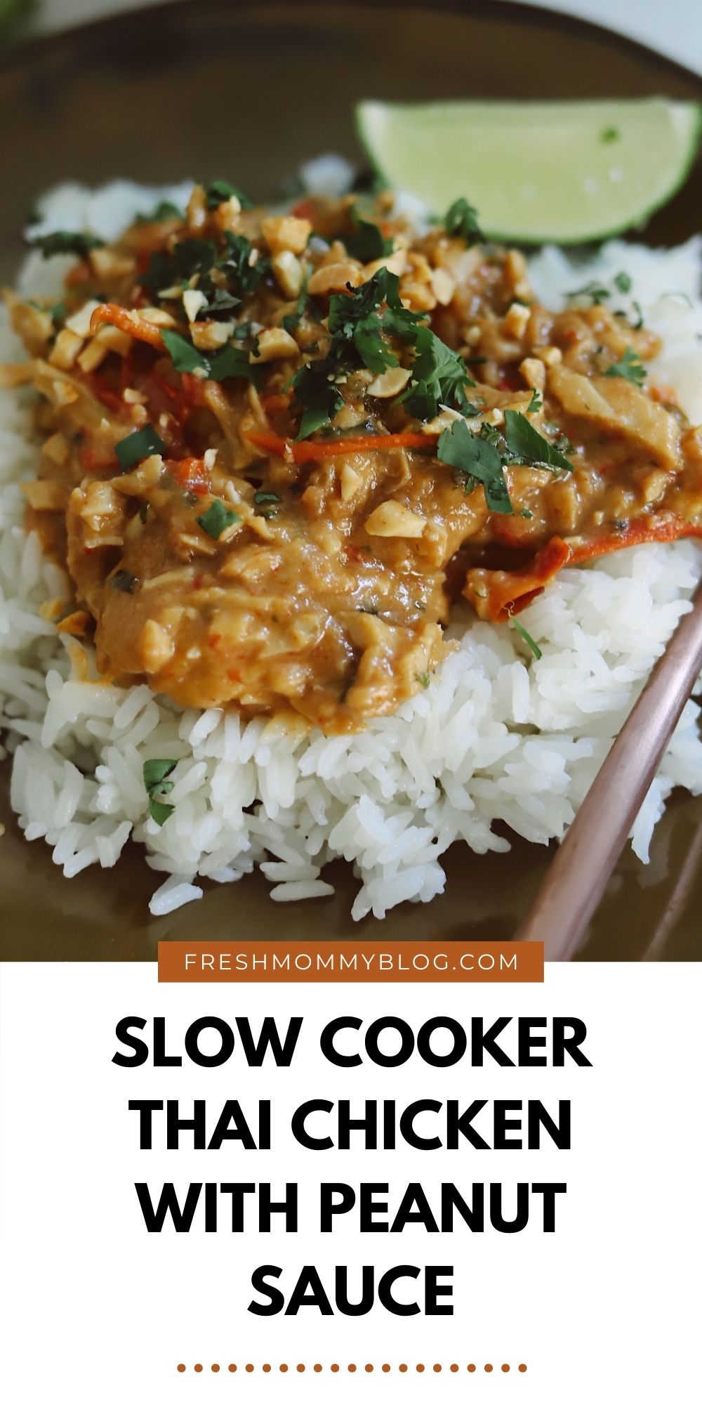 – 1 1/2 lbs chicken – 2 cloves garlic, minced – 1 C Broth – 1 C Peanut Butter – 1C Shredded Zucchini – 1/3 C Soy Sauce – 1 Red Pepper, Sliced – 1 Lime – Cilantro, Handful – White Rice for Serving