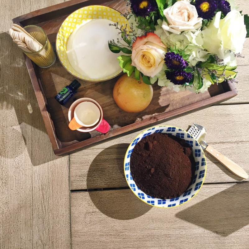 To make the scrubs, we started with two parts exfoliant to one part moisturizing oil and then added essential oils for the scent and benefits! For the exfoliant, you can use sugars, salt or coffee grounds (which is said to help with cellulite as well!). For the moisturizer, there are a plethora of oils available like coconut oil, , olive oil, etc. Mix together and then add in your favorite essential oils or blends to make a delightful body scrub!