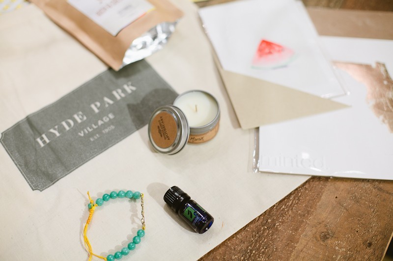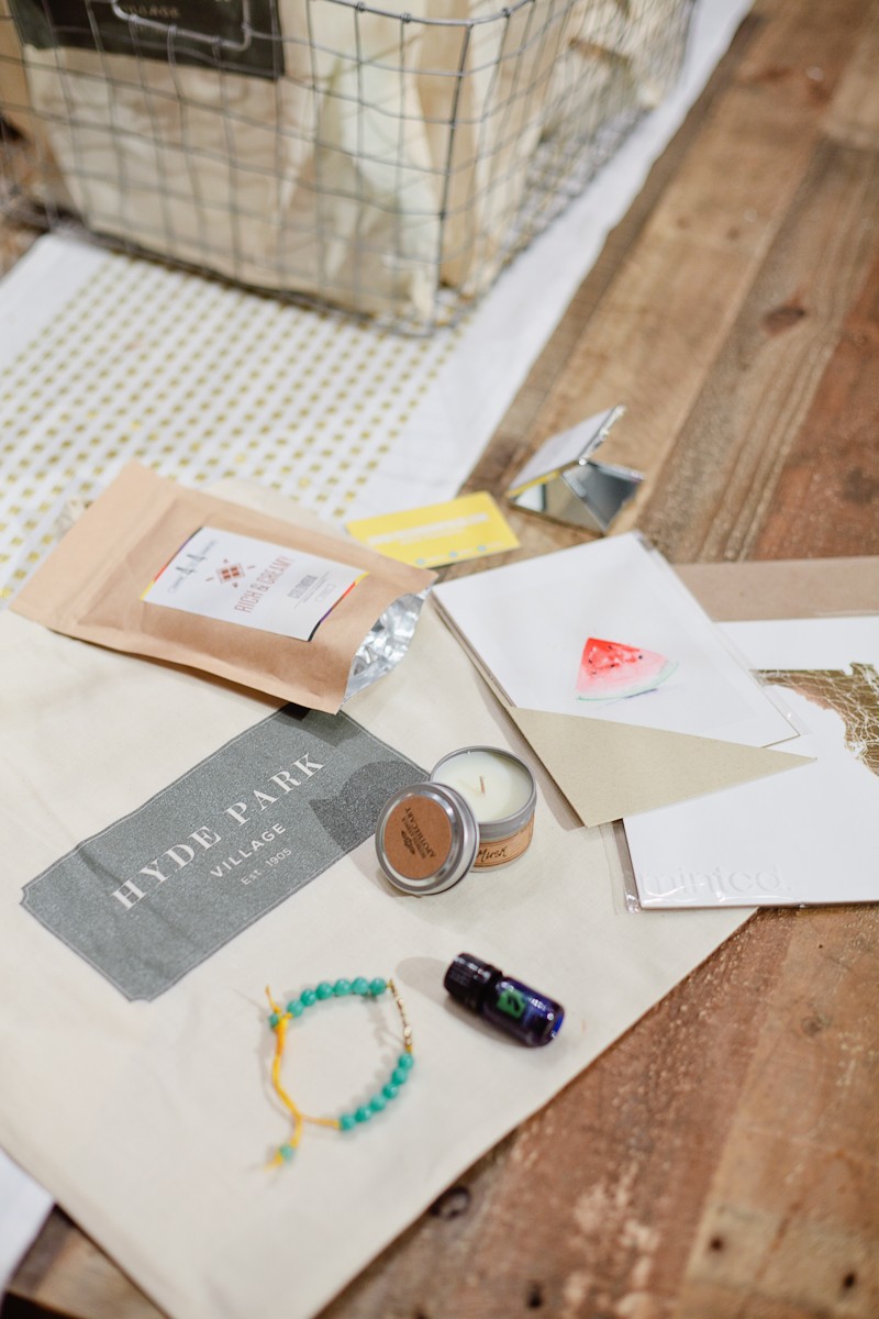We filled each Hyde Park Village tote bag with their own cosmetic mirror, a 4 oz bag of freshly roasted Pony Brand Coffee beans, a summery wall art print from Minted (loved the different prints!), a hand-poured soy candle from 7th Avenue Apothecary, a 5ml bottle of Lemon essential oil (which is a delicious addition to the white bean dip and to the iced tea!) and jewelry from Gemara’s Gems (available locally at Tate and Tilly).